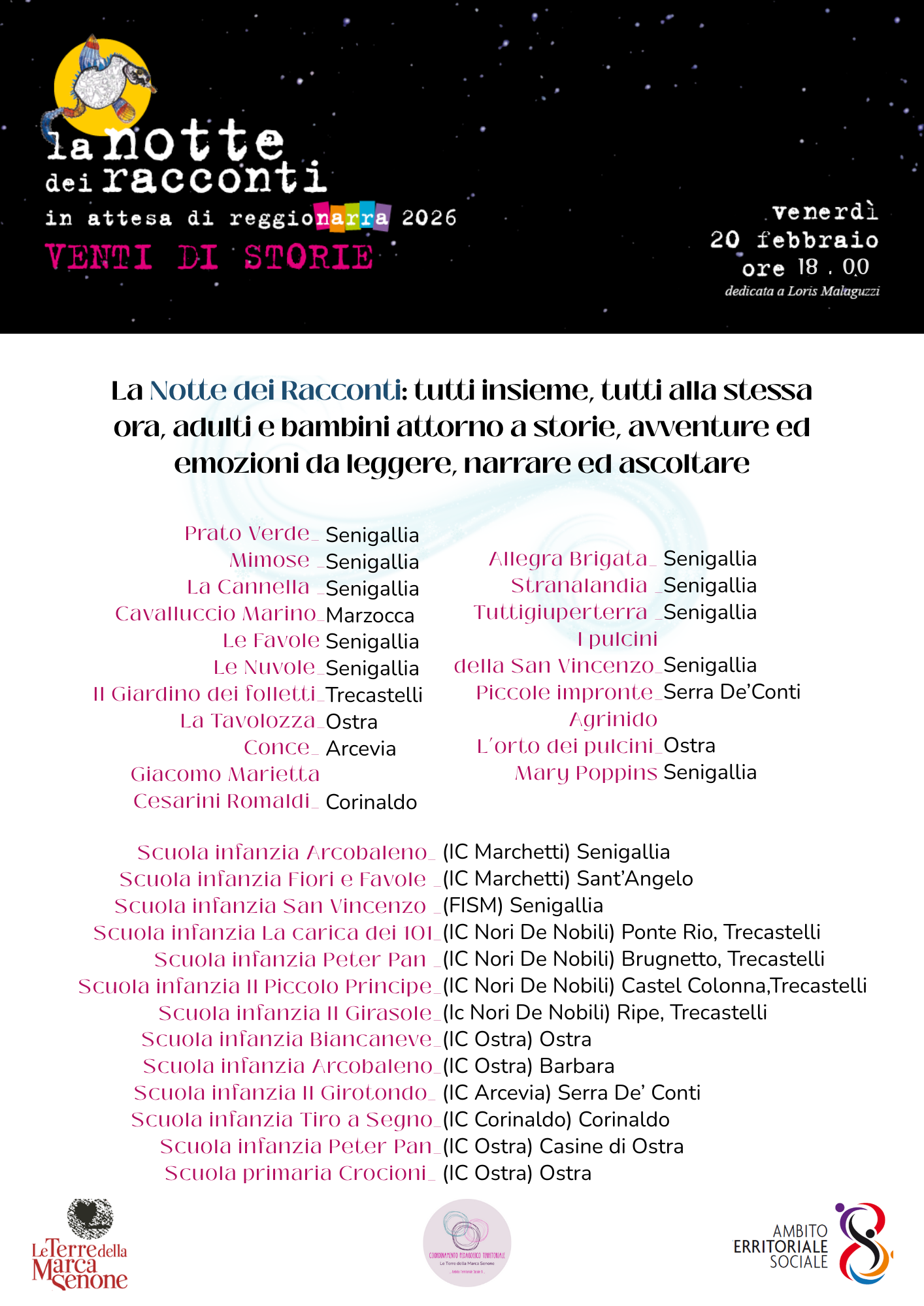 La Notte dei Racconti quest’anno si svolgerà il 20 febbraio 2026 dalle 18.00 alle 19:00 presso i servizi educativi adeelencati nella locandina.